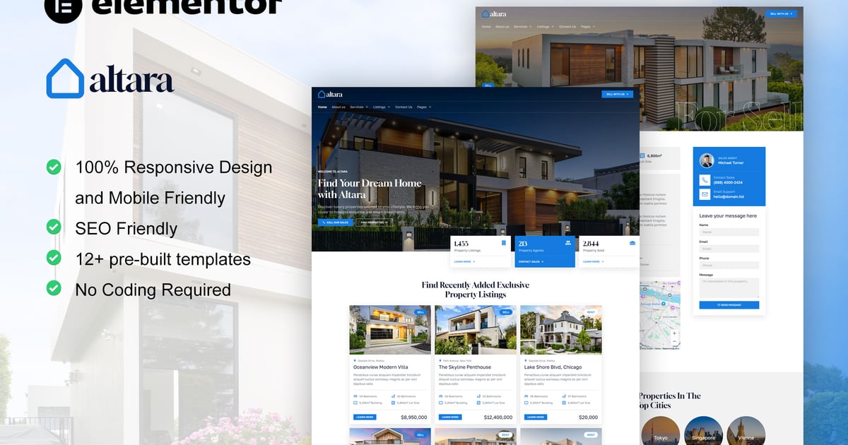Altara is an Elementor Pro Template Kit for real estate & property agent website. This template kit is perfect for real estate, property agent, interior designer, property listing, apartment agencies, architecture, and even furniture website. It has 12+ pre-built templates with cool design and modern style. You can easily make beautiful website with this elementor template kit.