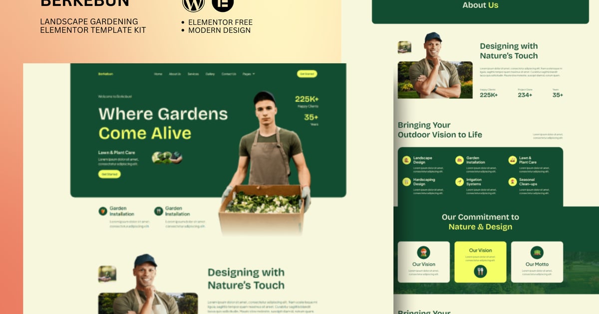 Berkebun – Landscape & Gardening Elementor Template Kit is a collection of layouts for the Elementor page builder WordPress plugin, designed for use with Elementor Free Version for a clean Design. It works with most themes and is optimized for use with the free Hello Elementor theme.