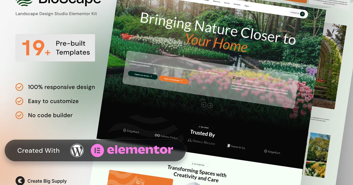 BioScape is a serene and sophisticated Elementor Template Kit crafted for landscape designers, outdoor decorators, garden consultants, and home improvement professionals. It blends organic aesthetics with clean layouts to present your design services, portfolio, and outdoor transformation projects with clarity.