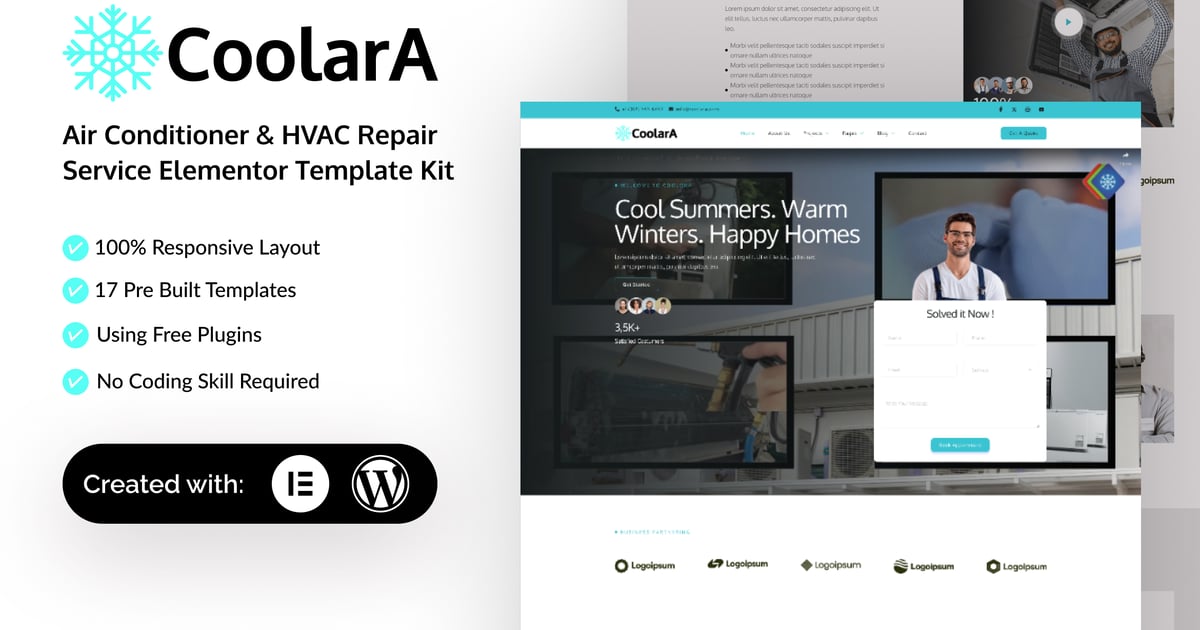 Coolara is a professional, modern and clean Elementor Template Kit designed for HVAC or air conditioning repair business. Built for WordPress, it seamlessly integrates with Elementor, enabling you to craft a professional website effortlessly—no coding skills required.