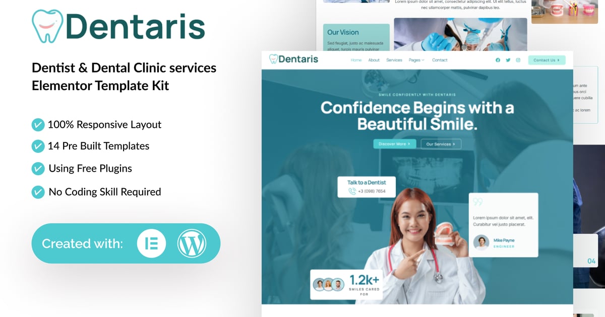 Dentaris is a professional, modern and clean Elementor Template Kit designed for Dentist & Dental Clinic Website. Built for WordPress, it seamlessly integrates with Elementor, enabling you to craft a professional website effortlessly—no coding skills required.