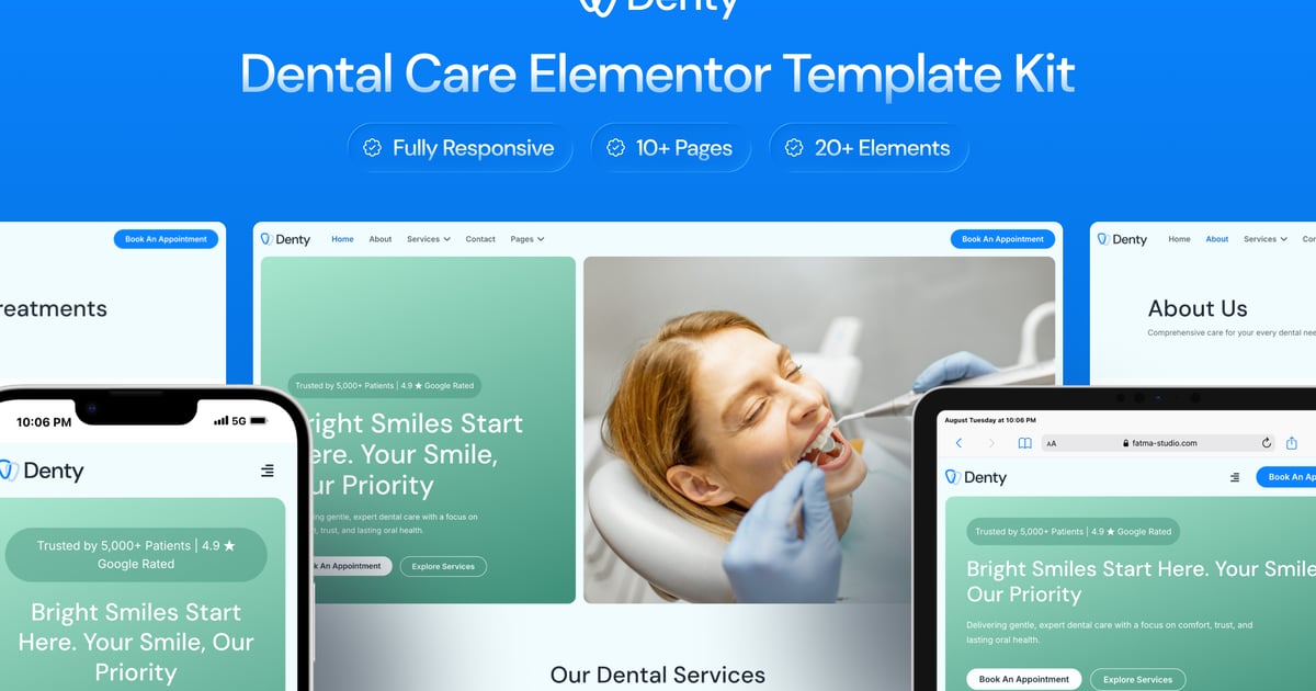 Denty is a clean and calming Elementor template kit designed specifically for dental clinics, orthodontists, and cosmetic dentistry practices. With a modern yet clinical look, this kit builds trust, improves patient engagement, and simplifies appointment booking.