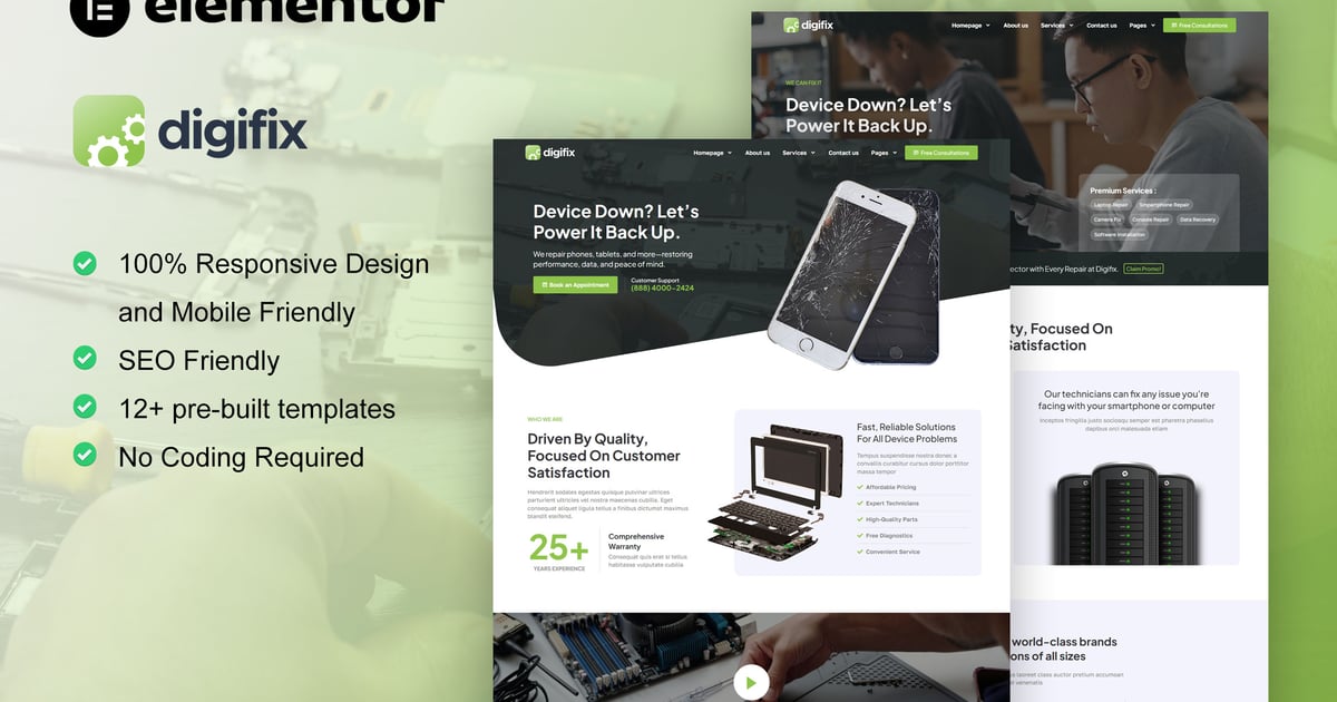 DigiFix is Elementor Pro Template Kit for Mobile Phone Repair Service website. This template has clean, modern, simple and professional look. You can easily build professional mobile phone repair website and its related service such as phone repair, computer repair, laptop service, device service, laptop service, computer maintenance, software and hardware service, data backup and even you can blogging while offering professional service for mobile phone and computer. Just drag and drop, no coding required.
