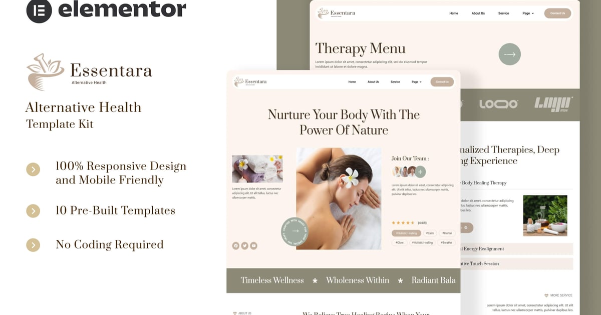 Essentara is an Elementor Template Kit thoughtfully crafted for alternative health practitioners and holistic wellness providers. It’s perfect for healing therapists, wellness coaches, and conscious brands looking to cultivate balance and well-being with intention and care. Essentara is built using free elements, making it both accessible and effortless to customize for anyone seeking a calming and grounded digital presence. Essentara provides various pages including Home, About Us, Service, Team, Pricing, FAQ’s, Testimonial, Blog, 404, Contact Us.