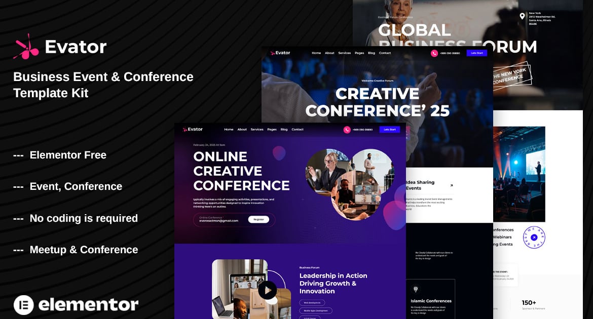 Evato is a solution that gives you responsive, modern and professional WordPress Landing Pages Elementor Template Kit. Template kit is designed for Meeting, Meetup conference, Schedule, Speakers, Startup. Evato Template Kit is used the popular Elementor page builder plugin, This template easily customizable, fully responsive and support all modern browser and device.