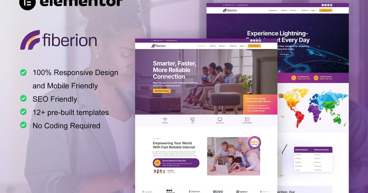 Fiberion is Elementor Pro Template Kit for broadband & internet service provider website. This template kit will help you to create any website related to broadband & internet provider services. It has 12+ pre-built templates with clean design and modern style. You can use this creative template kit for any kind of businesses or services related to broadband & internet services such as WIFI company, Satellite TV, Broadband, Online TV, Cable Television, Telecommunications Companies and any related businesses.