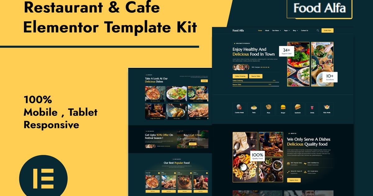 Food Alfa is an Elemenmtor Pro Template kit designed specifically for restaurants & cafes, catering, chefs, coffee shops, cuisine, drink, food, food delivery, menus, pubs, reservations, resorts.