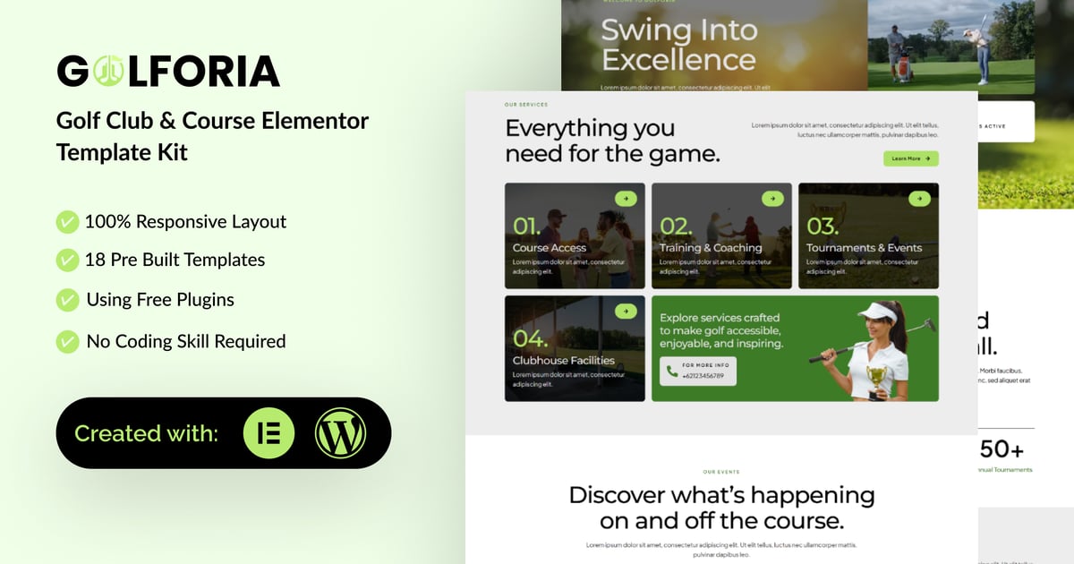 Golforia is a professional, modern and clean Elementor Template Kit designed for Golf Club & Course Company Website. Built for WordPress, it seamlessly integrates with Elementor, enabling you to craft a professional website effortlessly—no coding skills required.