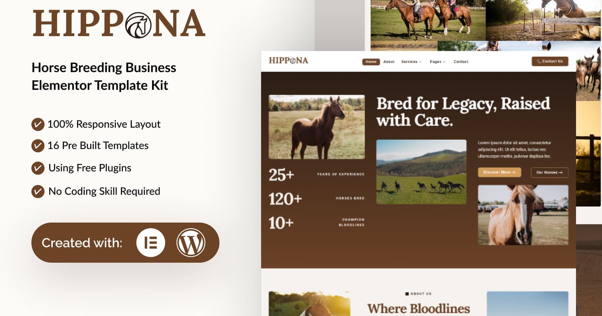 Hippona is a professional, modern and clean Elementor Template Kit designed for horse breeding farms, equestrian estates, and professional stud services. Built for WordPress, it seamlessly integrates with Elementor, enabling you to craft a professional website effortlessly—no coding skills required.