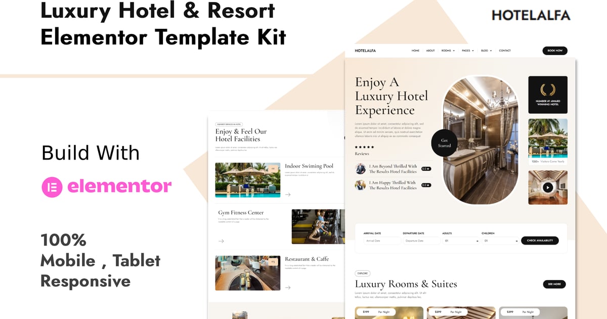 HotelAlfa is an Elementor Pro Template Kit offering an exquisite and distinctive design for Hotels, Resort, Villa, Guesthouse or any hospitality business.
