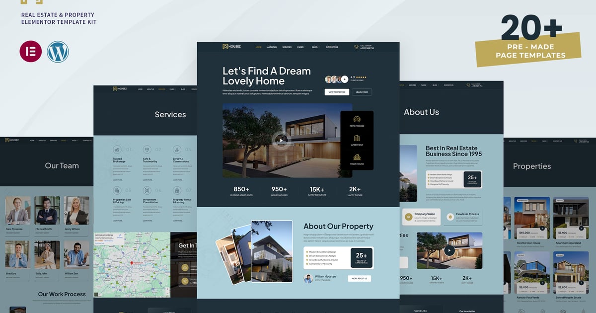 Housez – Real Estate & Property Elementor Template Kit created especially to build versatile sites such as housing, home rental, real estate, property, apartment, construction, building, and all other Real Estate & Property websites without a single line of coding!