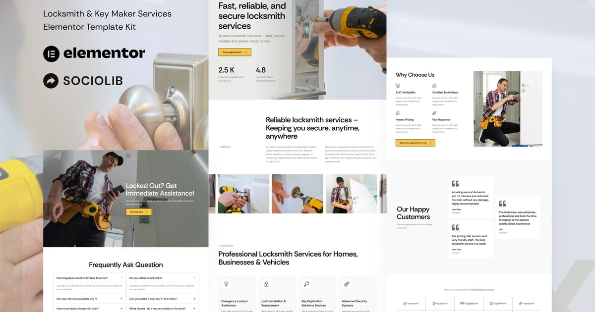 LockFix is an Elementor Template Kit for quickly and easily creating Locksmith & Key Maker Service website using the Elementor Page Builder plugin for WordPress. Suitable for Locksmith, Key Maker, Handyman, Home Service, Security Service, Lock Installation, Emergency Assistance, Key Duplication, Home Security Service, etc. Style your WordPress website with this creative and modern web design style template kit to bring a modern feel to your blog.