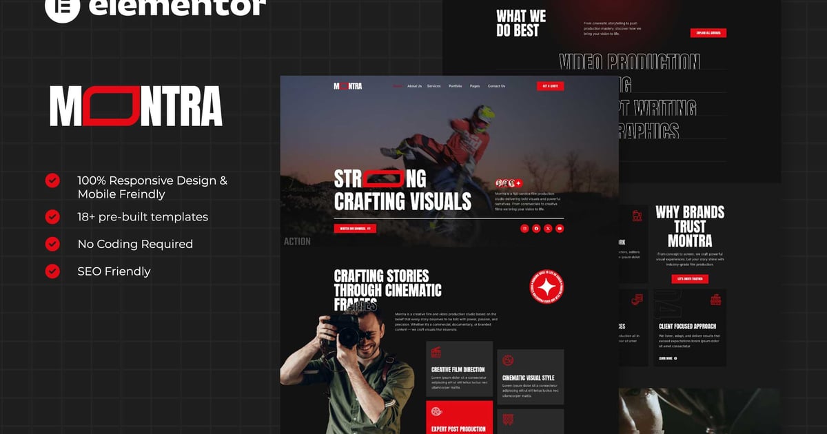 Montra is modern and elegant elementor template kits for Film & Video Production Studio. You can also use this creative template kit for any kind of business and services related to film studio, video production, videography, filmmaker, movie maker, film agency, video editor, video agency, production house, creative studio, short film, cinematic, elementor kit, video template, film website and all other Film & Video Production Studio websites. etc.