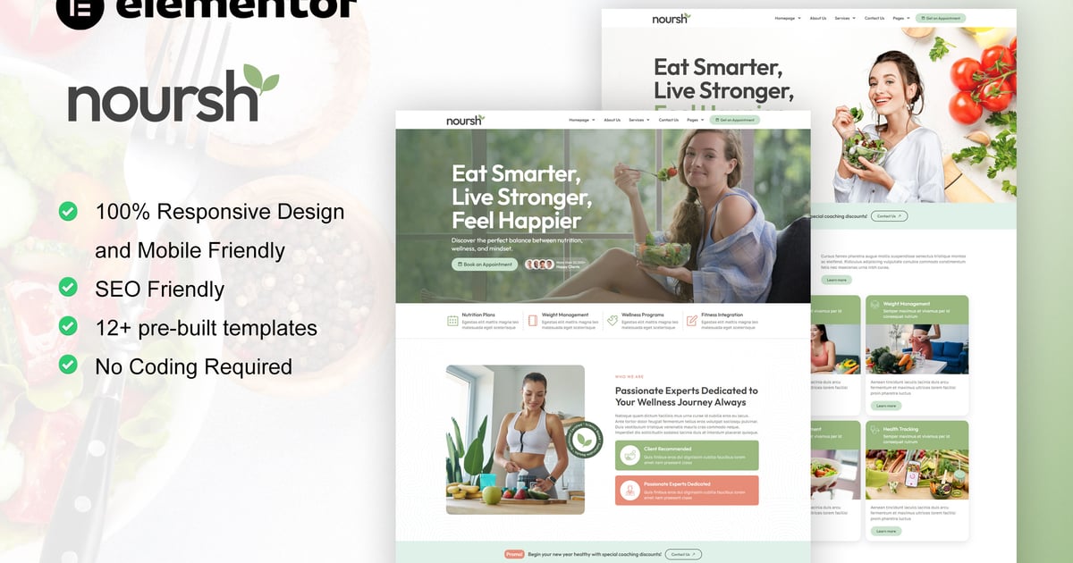 Noursh is Elementor Pro Template Kit for Healthy Food & Nutrition service website. This template kit is perfect for any business or service that provide nutrition service, healthy food, diet program, healthy menu service, nutrition coach, healthy trainer, organic food, etc. It has 12+ pre-built templates with simple design and modern style.