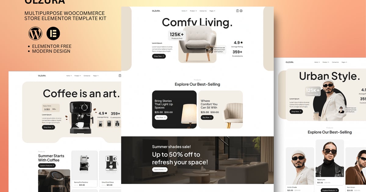 Olzura – Multipurpose Woocommerce Store Elementor Template Kit is a collection of layouts for the Elementor page builder WordPress plugin, designed for use with Elementor Free Version for a clean Design. It works with most themes and is optimized for use with the free Hello Elementor theme.