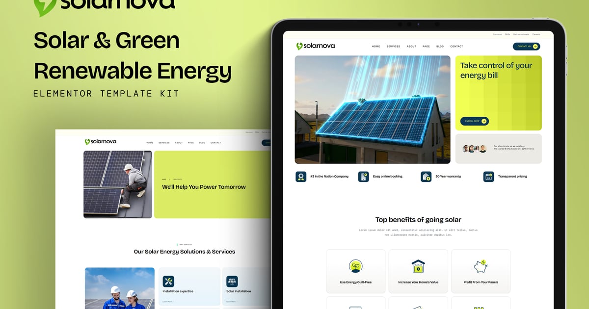 Solarnova – Solar & Green Renewable Energy Elementor Template Kit is created especially for green energy, solar energy, and solar panel, or any type of business that wants to publish their services in a professional way. Solarnova has a simple, modern, and clean design with a 100% responsive layout, and it is very easy to customize, making it accessible to anyone without needing to understand coding.