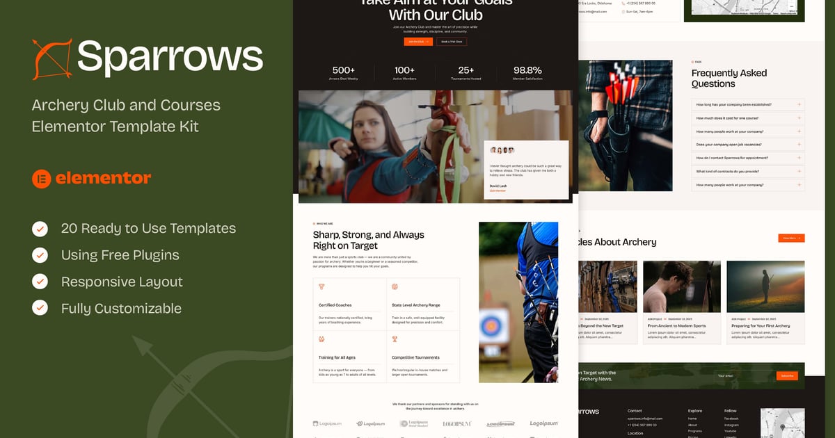 Sparrows – Archery Club & Courses Elementor Template Kit (NOT A Wordpress Theme) is created especially for archery clubs, sports associations, training academies, and outdoor activity groups. Sparrows has a simple, modern and clean design with 100% responsive layout, and very easy to customize and can be used by anyone without having to understand coding.