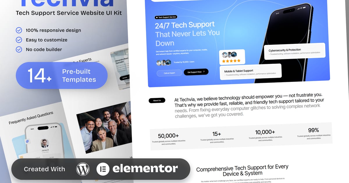 This kit includes essential pages such as Home, About Techvia, Services, Remote Support, Device Repair & Maintenance, Cybersecurity Solutions, Pricing Plans, Knowledge Base / FAQs, Testimonials, and Contact Us. Fully responsive and SEO-friendly, every template is easy to customize with Elementor—no coding required.