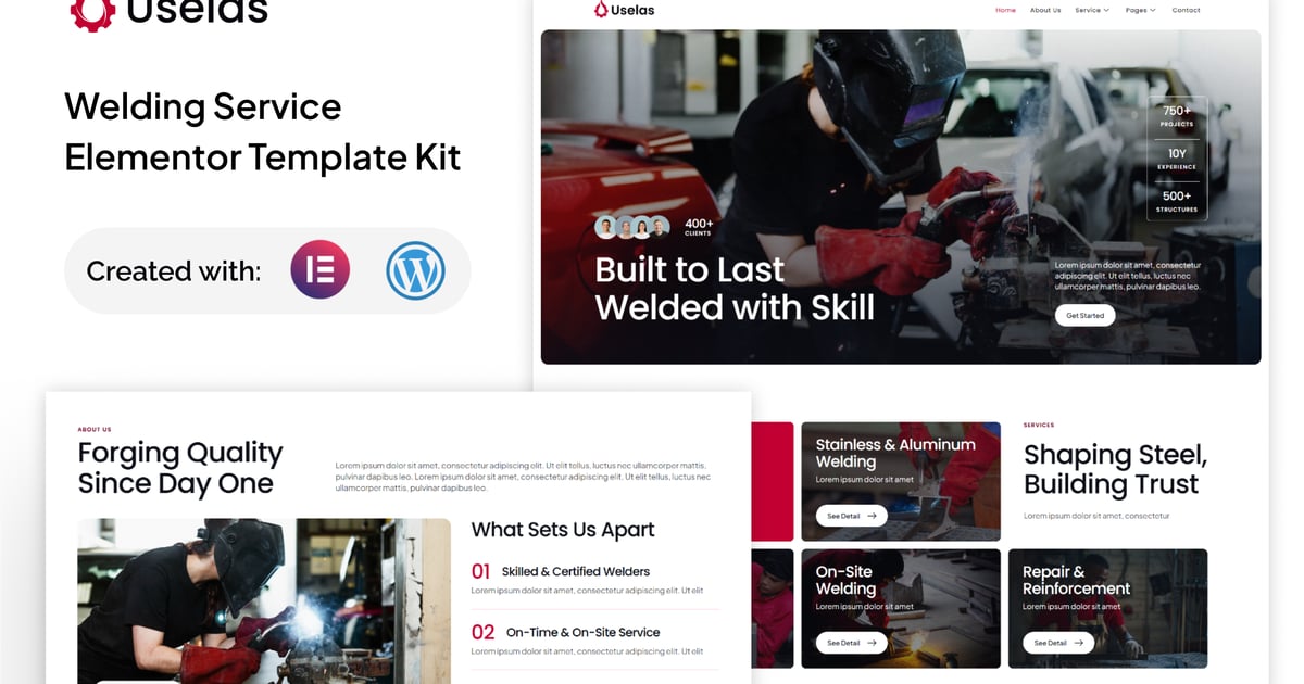 Uselas is a professional, modern and clean Elementor Template Kit designed for Welding Service Website. Built for WordPress, it seamlessly integrates with Elementor, enabling you to craft a professional website effortlessly—no coding skills required.