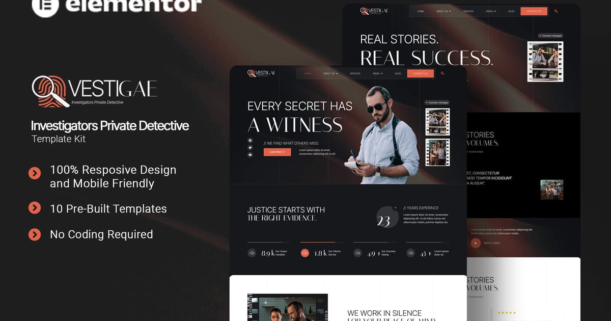 Vestigae is a sleek and powerful Elementor Template Kit tailored for private investigators and detective agencies looking to build a credible and discreet online presence. Perfect for surveillance experts, legal investigation firms, and freelance detectives, this kit allows you to highlight professional services, showcase case study successes, and promote confidential investigative solutions with clarity and confidence. Vestigae uses free elements, so don’t worry about trying this one. Vestigae provides various pages including Home, About Us, Team, Services, Case Studies, Pricing, FAQs, Testimonials, 404, Blog, Contact Us.