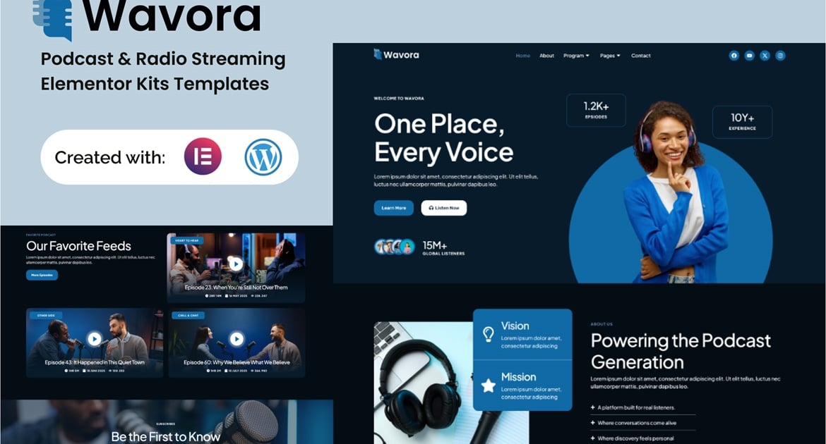 Wavora is a professional, modern and clean Elementor Template Kit designed for Podcast & Radio Streaming Website. Built for WordPress, it seamlessly integrates with Elementor, enabling you to craft a professional website effortlessly—no coding skills required.