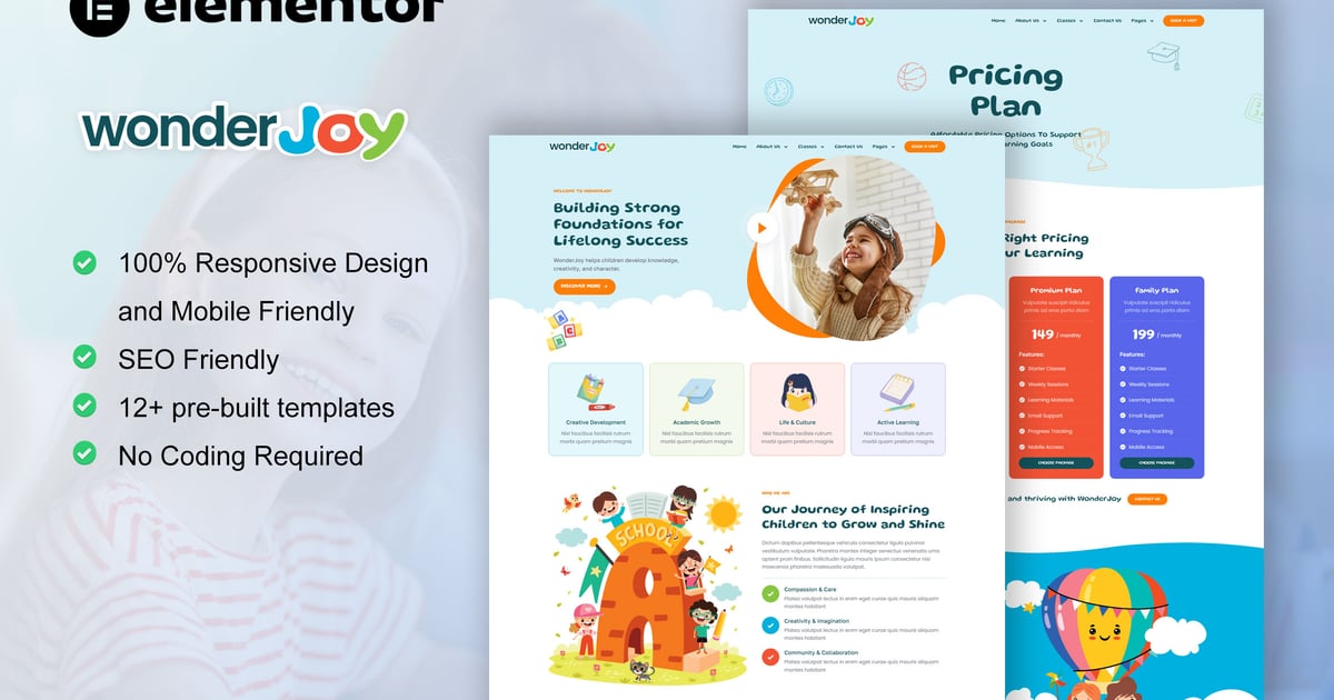 WonderJoy is an Elementor Pro Template Kit for kindergarten and child care such as daycare, art classes, math class,special education for kids and children playgroup. This template has clean, modern, fun, and colorful layout style. Perfect for any business or service related to kid and children education.