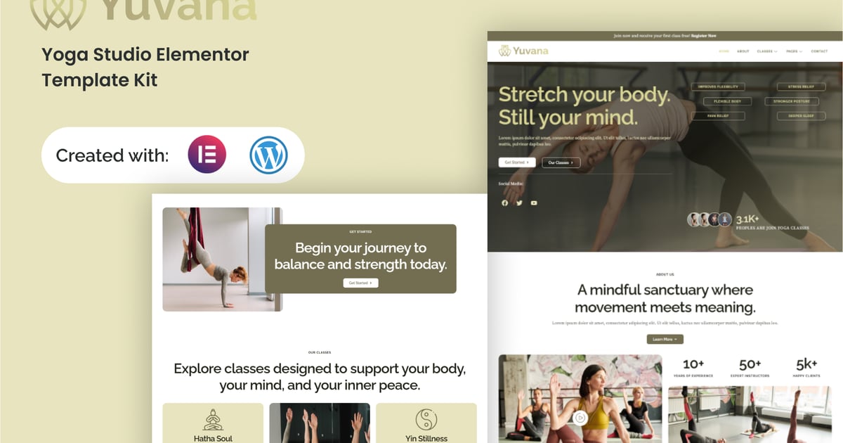 Yuvana is a professional, modern and clean Elementor Template Kit designed for Yoga Studio Website. Built for WordPress, it seamlessly integrates with Elementor, enabling you to craft a professional website effortlessly—no coding skills required.